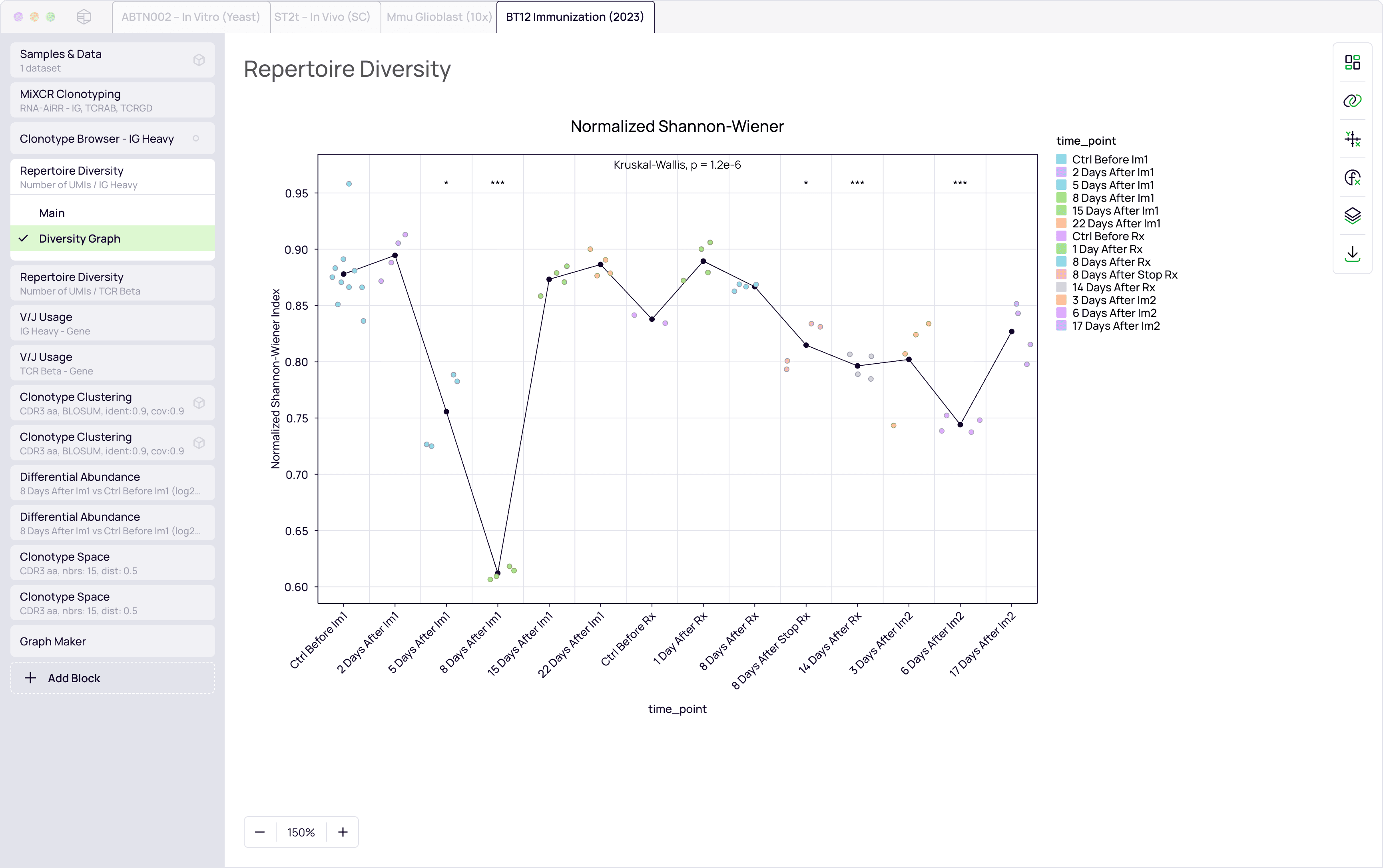 Compare diversity metrics and clonotype abundances across patient groups. Automatically apply robust statistical tests (e.g., Kruskal-Wallis, Wilcoxon) directly against clinical metadata.