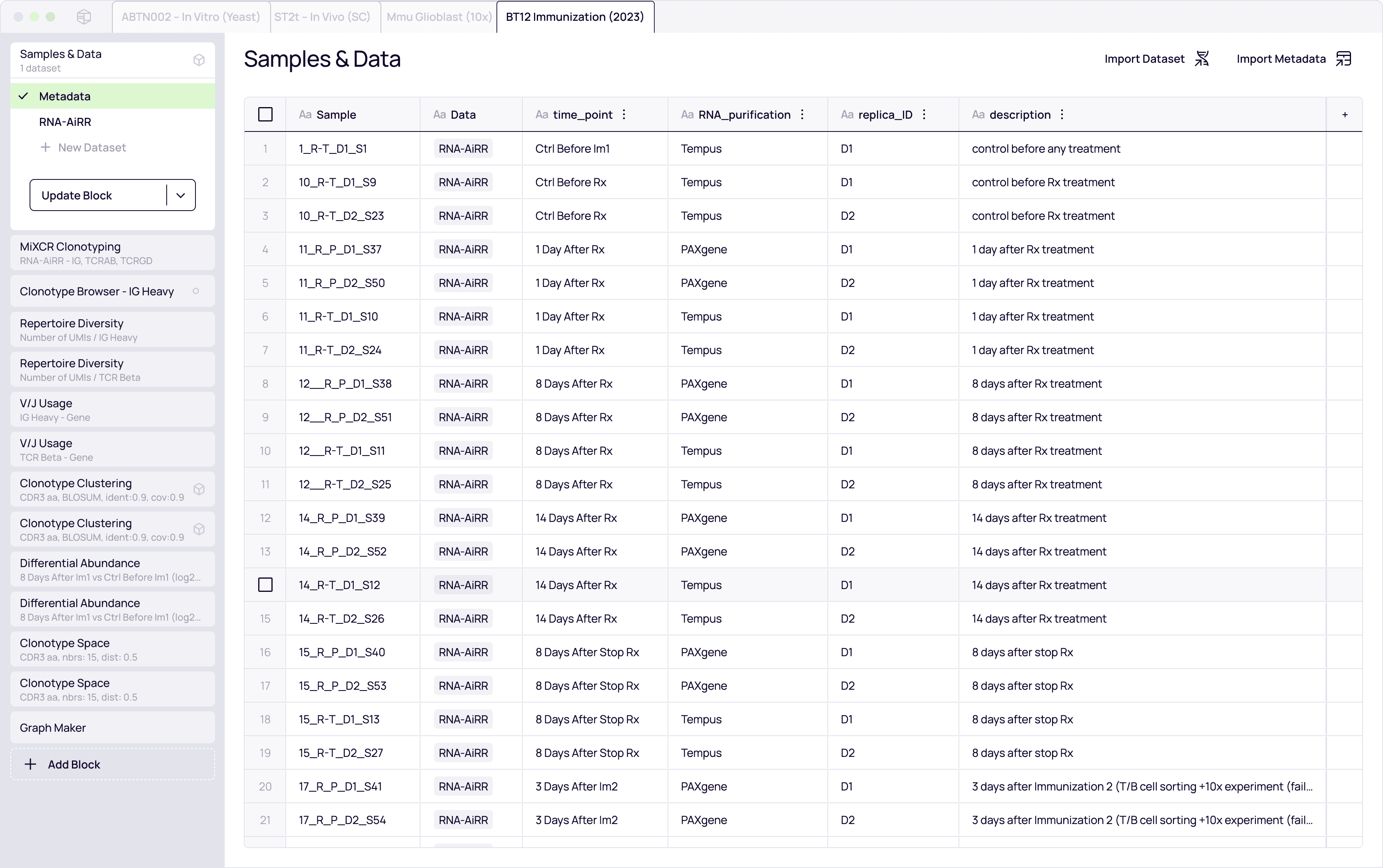 Monitoring minimal residual disease (MRD) or therapy responses requires tracking specific clonotypes across timepoints—a process that easily breaks down in disjointed spreadsheets.