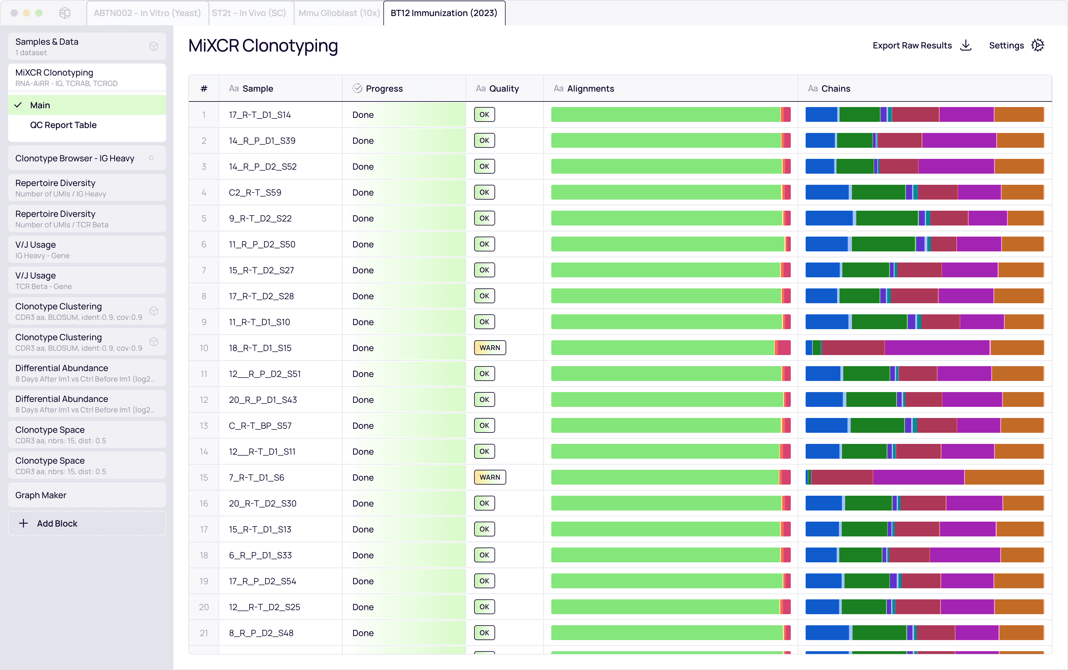Monitor immune kinetics. Track specific T-cell or B-cell clonotypes across multiple clinical timepoints, treatment rounds, or tissues without manual data re-formatting.